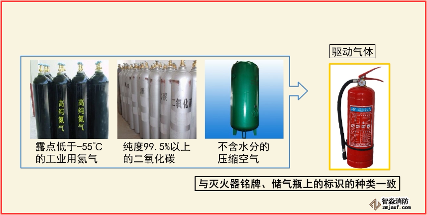 (6)儲(chǔ)壓式干粉滅火器和潔凈氣體滅火器可選用露點(diǎn)低于-55℃的工業(yè)用氮?dú)?、純?9.5%以上的二氧化碳、不含水分的壓縮空氣等作為驅(qū)動(dòng)氣體,但要與滅火器銘牌、儲(chǔ)氣瓶上標(biāo)識(shí)的種類一致。