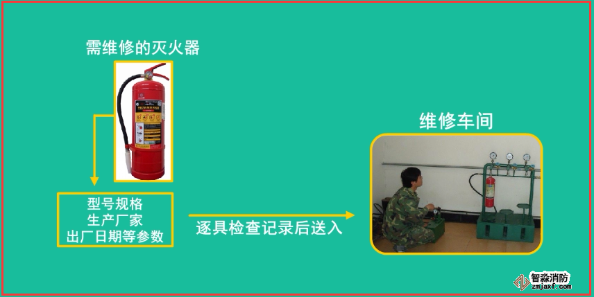 首先進(jìn)行滅火器外觀檢查,再按照拆卸、報(bào)廢處理、水壓試驗(yàn)、清洗干燥、更換零部件、再充裝及氣密性試驗(yàn)、維修出廠檢驗(yàn)、建立維修檔案等程序逐次實(shí)施維修。