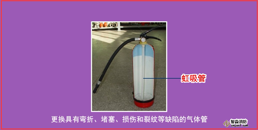 (6)更換具有彎折、堵塞、損傷和裂紋等缺陷的滅火器虹吸管、儲(chǔ)氣瓶式滅火器出氣管。