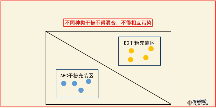 (3)ABC干粉、BC干粉充裝設(shè)備分別獨(dú)立設(shè)置,充裝場(chǎng)地完全分隔開。不同種類干粉不得混合,不得相互污染。