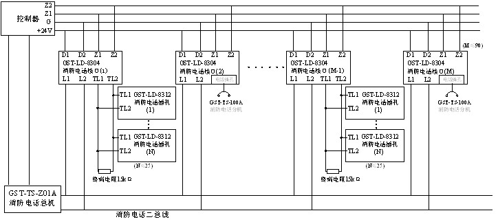 Z1、Z2采用截面積≥1.0mm2的阻燃RVS雙絞線,DC24V電源線采用截面積≥1.5mm2的阻燃BV線,TL1、TL2、L1、L2采用截面積≥1.0mm2的阻燃RVVP屏蔽線。