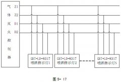 海灣GST-LD-8317噴灑燈與氣體滅火控制器的總線和電源 DC24V相連,實現(xiàn)噴灑噴灑功能。具體連接方法如圖 5- 17 所示。