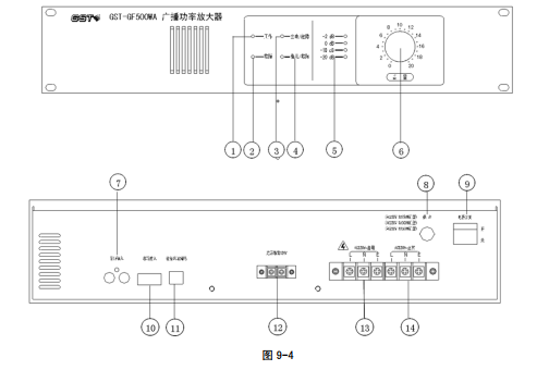 以 GST-GF500WA 型廣播功率放大器為例進(jìn)行說明,其外形及結(jié)構(gòu)示意圖如圖 9-3。