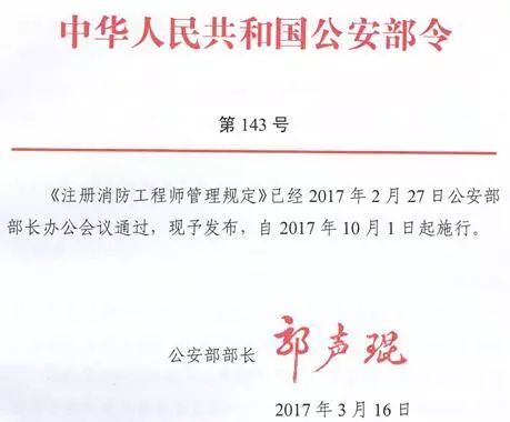 2017年3月16日,公安部下發(fā)第143號文件,宣布《注冊消防工程師管理規(guī)定》已于2017年2月27日在公安部部長會議上通過,2017年10月1日起實施。