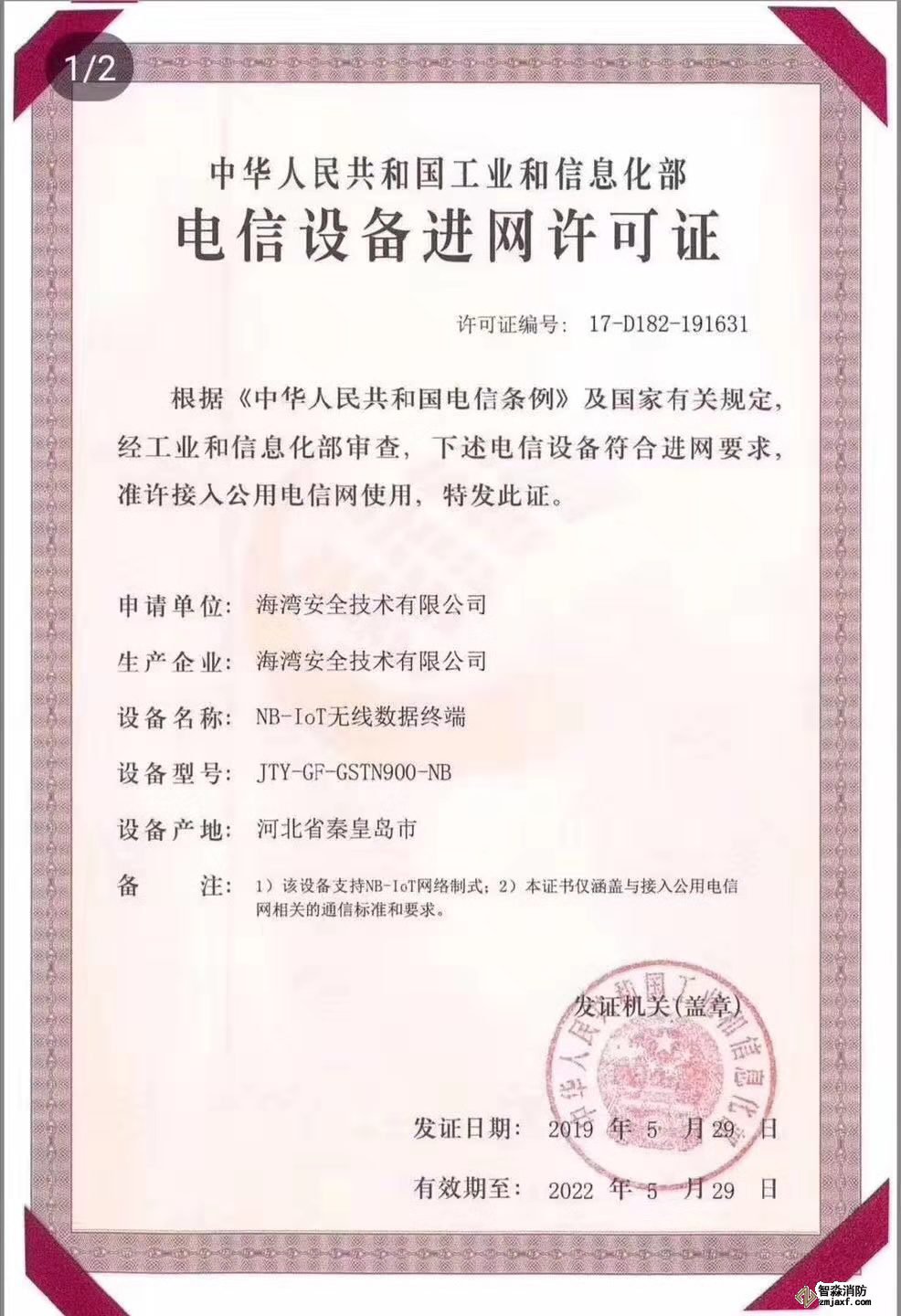 海灣智慧消防NB煙感是國內(nèi)唯一可提供工信部入網(wǎng)許可證的廠家