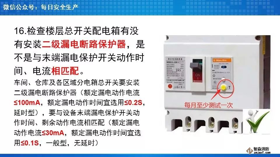 漏保參數(shù)不符(開關(guān)箱中漏電保護(hù)器的額定漏電動(dòng)作電流不應(yīng)大于30mA,額定漏電動(dòng)作時(shí)間不應(yīng)大于0.1s??偱潆娤湟蟠笥?0mA,大于0.1s,但乘積不應(yīng)大于30mA·s。)