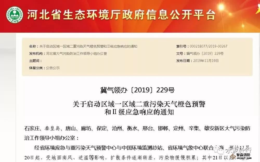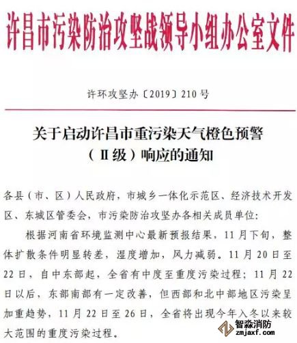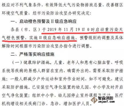 為保護(hù)公眾健康,降低大氣污染強(qiáng)度,指揮部辦公室決定于11月20日13:30時發(fā)布重污染天氣橙色預(yù)警信息,從2019年11月20日16時起啟動Ⅱ級應(yīng)急響應(yīng)。