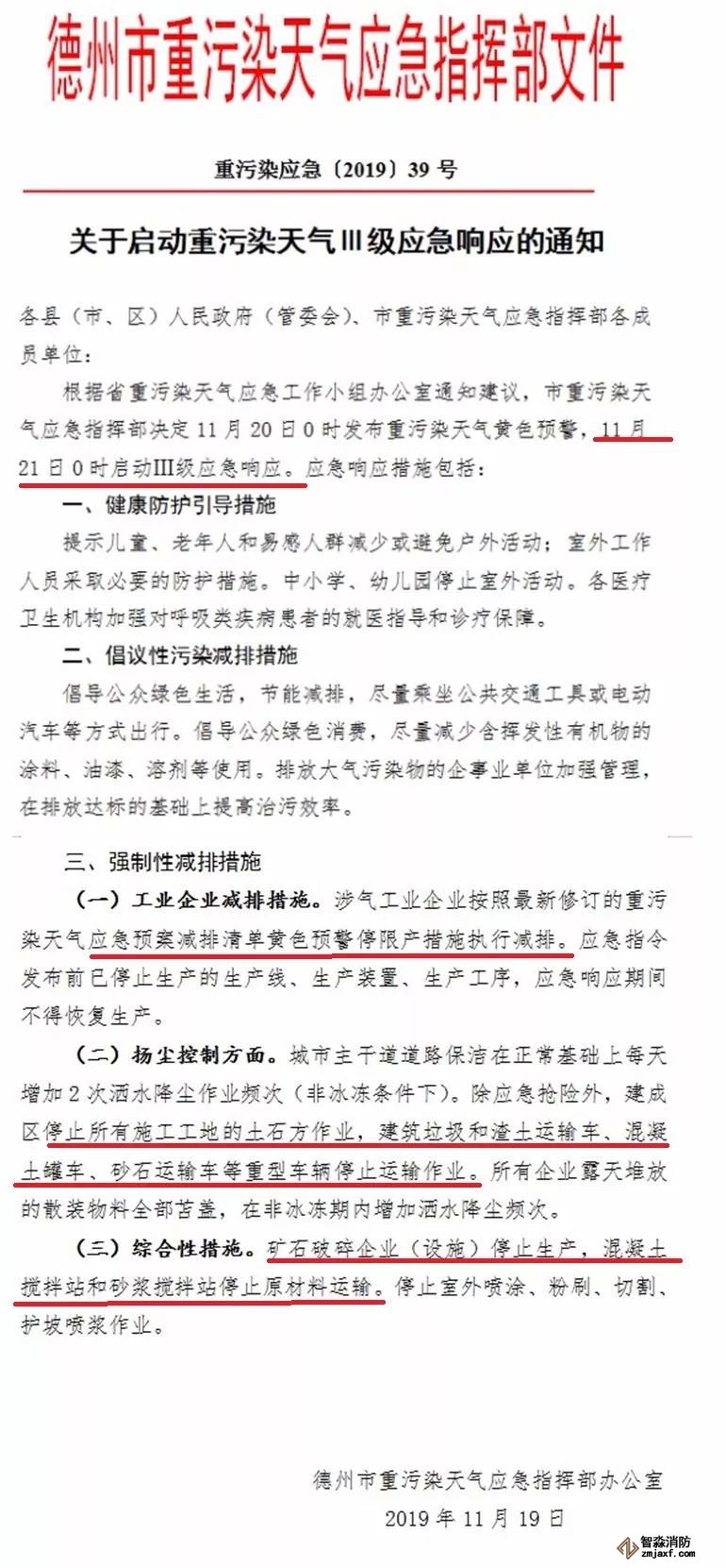 11月19日,市重污染天氣應(yīng)急指揮部發(fā)布通知,根據(jù)省重污染天氣應(yīng)急工作小組辦公室通知建議,市重污染天氣應(yīng)急指揮部決定11月20日0時發(fā)布重污染天氣黃色預(yù)警,11月21日0時啟動重污染天氣Ⅲ級應(yīng)急響應(yīng)。