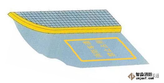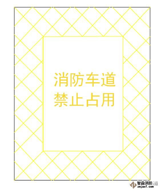 在單位或者住宅區(qū)的消防車通道出入口路面,按照消防車通道凈寬施劃禁停標(biāo)線,標(biāo)線為黃色網(wǎng)狀實(shí)線,外邊框線寬20厘米,內(nèi)部網(wǎng)格線寬10厘米,內(nèi)部網(wǎng)格線與外邊框夾角45度,標(biāo)線中央位置沿行車方向標(biāo)注內(nèi)容為“消防車道禁止占用”的警示字樣;