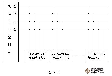 噴灑燈與氣體滅火控制器的總線和電源DC24V相連,實(shí)現(xiàn)噴灑噴灑功能。具體連接方法如圖5-17所示。