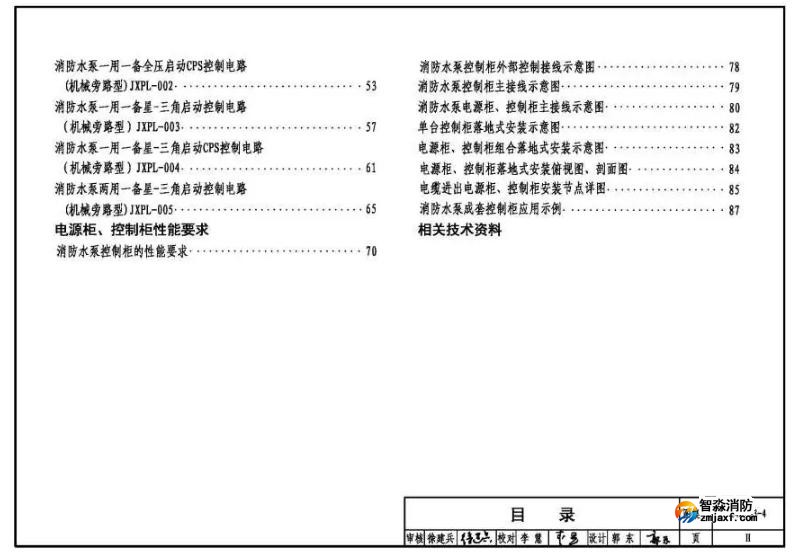 圖集提供消防水泵電動機一用一備全壓啟動、一用一備星-三角降壓啟動、兩用一備星-三角降壓啟動三種常用啟動類型的機械應(yīng)急啟動控制,水泵電動機采用AC380V三相異步籠型電動機,最大容量為110kW。其他類型消防水泵機械應(yīng)急啟動控制電路可根據(jù)國家建筑標準圖集D303-3《常用水泵控制電路圖》,并參考本圖集做相應(yīng)修改。