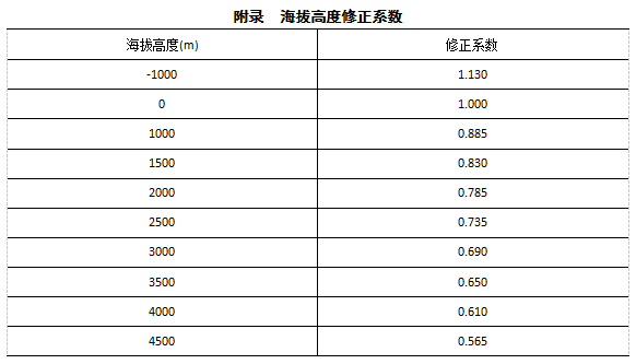 第四步:查出您所在地區(qū)的海拔修正系數(shù)K,K值可根據(jù)規(guī)范GB50370-2005 附表查詢(xún)。