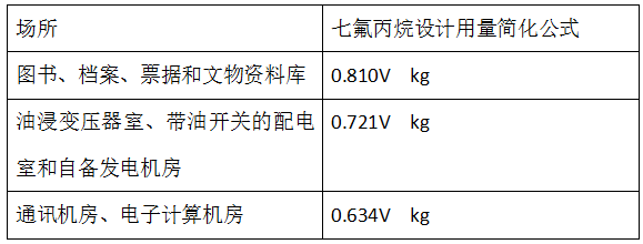 一般情況下,各場(chǎng)所的七氟丙烷設(shè)計(jì)用量粗算公式(單位:kg)