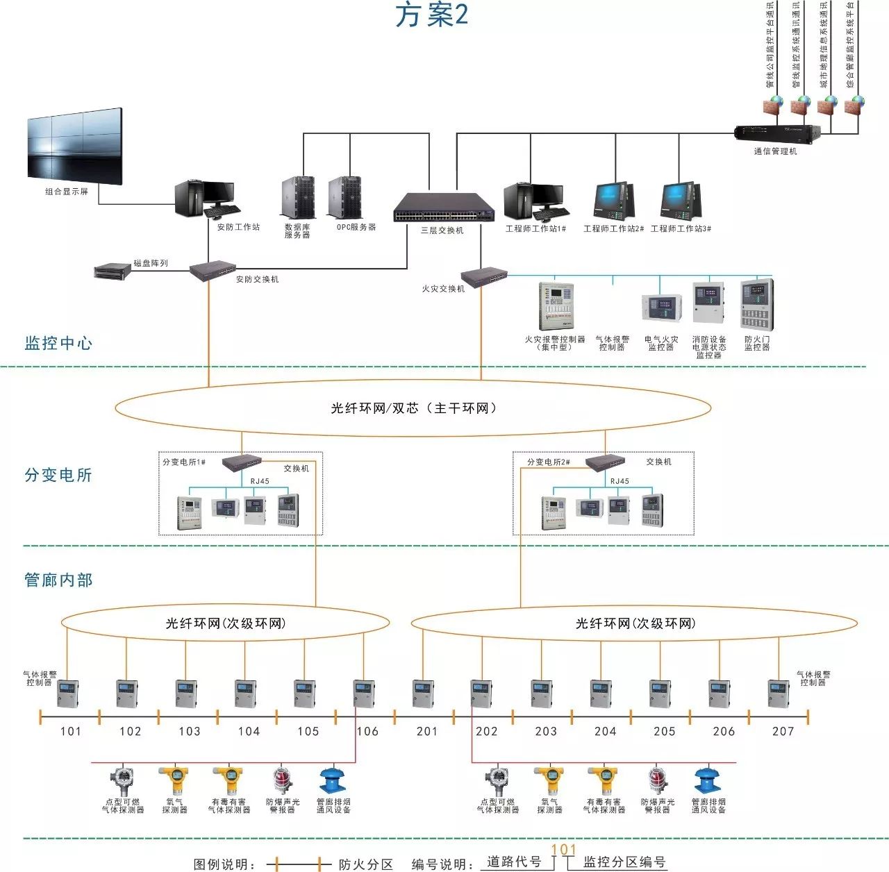 本方案僅針對(duì)管廊燃?xì)馀搩?nèi)的可燃?xì)怏w報(bào)警系統(tǒng)設(shè)計(jì),未涉及自控單元及安防單元與火災(zāi)報(bào)警系統(tǒng)。通過(guò)共用變電所監(jiān)控?cái)?shù)據(jù)交換機(jī)與總控室可燃?xì)怏w報(bào)警控制器組成光纖環(huán)網(wǎng)。