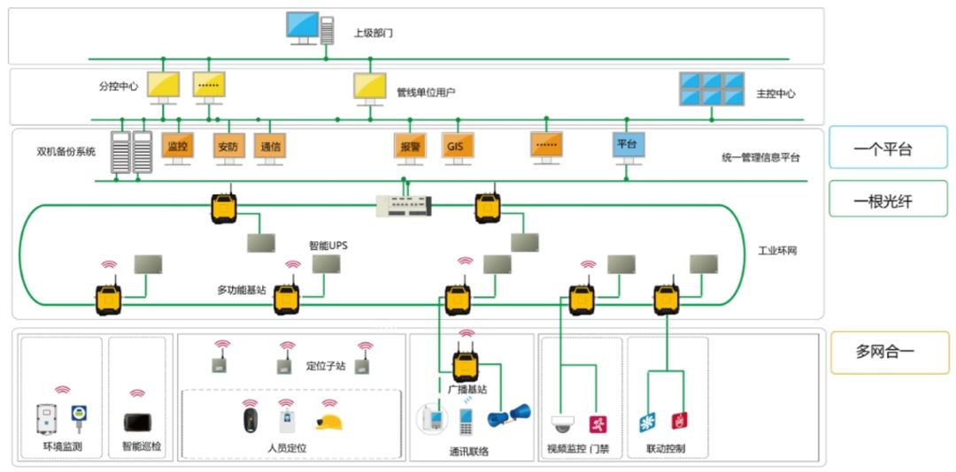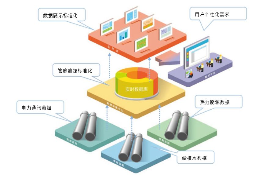 井下所有的信息都要傳到平臺(tái)監(jiān)控中心,而監(jiān)控中心的各種控制命令則要傳輸?shù)礁鞫喂芾鹊母鞣N設(shè)備上。在此基礎(chǔ)上,用戶可以很順利的處理來(lái)自不同設(shè)備及環(huán)境的數(shù)據(jù),滿足末端設(shè)備擴(kuò)展需求。管廊數(shù)據(jù)標(biāo)準(zhǔn)化、數(shù)據(jù)展示標(biāo)準(zhǔn)化、電力通訊數(shù)據(jù)、熱力能源數(shù)據(jù)、給排水?dāng)?shù)據(jù)、用戶個(gè)性化需求,利用物聯(lián)網(wǎng)對(duì)地下管廊進(jìn)行感知和識(shí)別,通過(guò)網(wǎng)絡(luò)互聯(lián)進(jìn)行傳輸、計(jì)算、處理和數(shù)據(jù)挖掘,實(shí)現(xiàn)對(duì)地下管廊的實(shí)時(shí)控制、精確管理和科學(xué)決策。