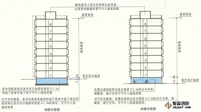 對于住宅建筑,設(shè)置在底部且室內(nèi)高度不大于2.2m的自行車庫、儲藏室、敞開空間,室內(nèi)外高差或建筑的地下或半地下室的頂板面高出室外設(shè)計地面的高度不大于1.5m的部分,可不計入建筑高度。