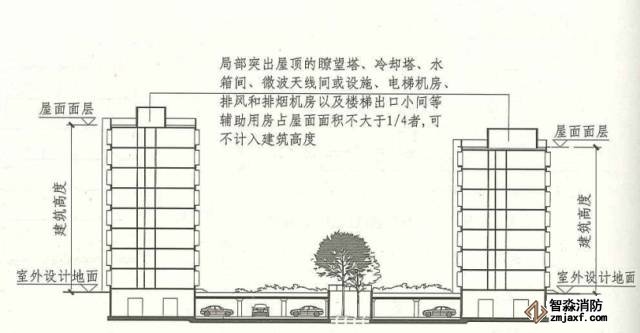 局部突出屋頂?shù)泥谕?、冷卻塔、水箱間、微波天線間或設(shè)施、電梯機(jī)房、排風(fēng)和排煙機(jī)房以及樓梯出口小間等輔助用房占屋面面積不大于1/4者,可不計入建筑高度。