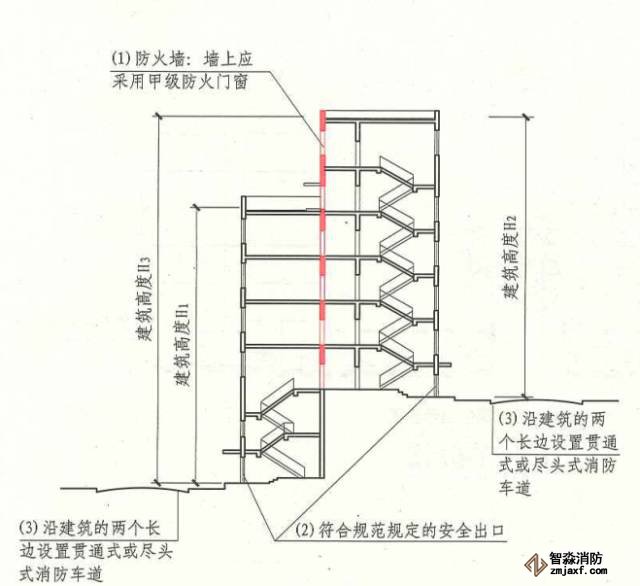 對于臺階式地坪,當(dāng)位于不同高程地坪上的同一建筑之間有防火墻分隔,各自有符合規(guī)范規(guī)定的安全出口,且可沿建筑的兩個長邊設(shè)置貫通式或盡頭式消防車道時,可分別計算各自的建筑高度。否則,應(yīng)按其中建筑高度最大者確定該建筑的建筑高度。