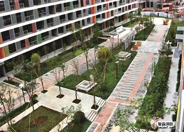 ▲用草坪預(yù)留出隱形消防道,但是空間過(guò)于拘泥于形式,效果呆板