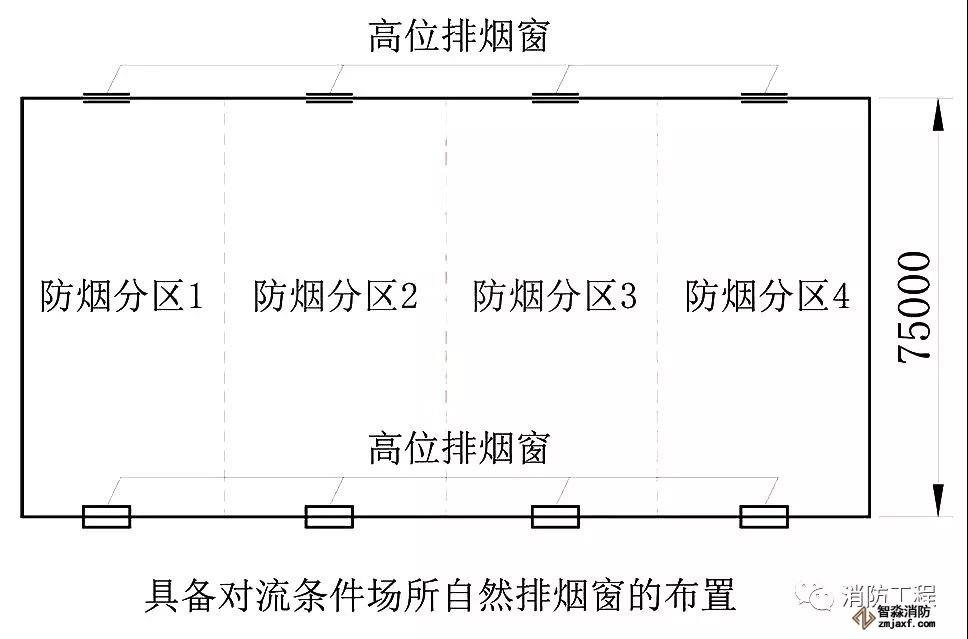 兩個(gè)排煙窗應(yīng)設(shè)在防煙分區(qū)短邊外墻面的同一高度位置上(見(jiàn)下圖),窗的底邊應(yīng)在室內(nèi)2/3高度以上且應(yīng)在儲(chǔ)煙倉(cāng)以內(nèi)。