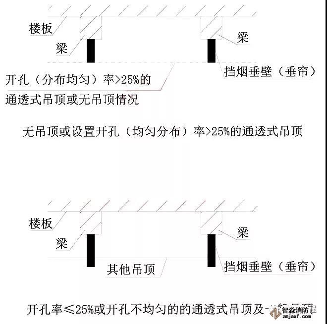 注:設(shè)置擋煙垂壁(垂簾)是劃分防煙分區(qū)的主要措施。擋煙垂壁(垂簾)所需高度應(yīng)根據(jù)建筑所需的清晰高度以及設(shè)置排煙的可開啟外窗或排煙風(fēng)機(jī)的量,針對(duì)區(qū)域內(nèi)是否有吊頂以及吊頂方式分別進(jìn)行確定,參見(jiàn)下圖。