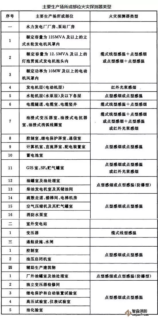 2、主要生產(chǎn)場所或部位應(yīng)設(shè)置火災(zāi)探測器?;馂?zāi)探測器類型可按下表的規(guī)定進行配置。