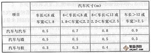 汽車之間和汽車與墻、柱之間的水平距離(m)