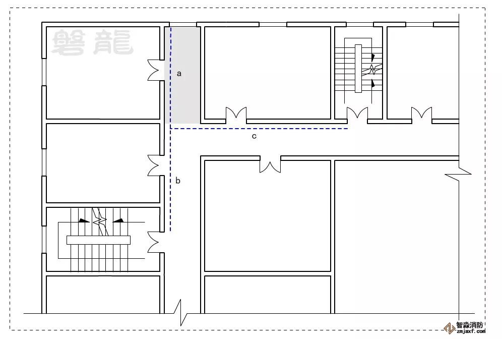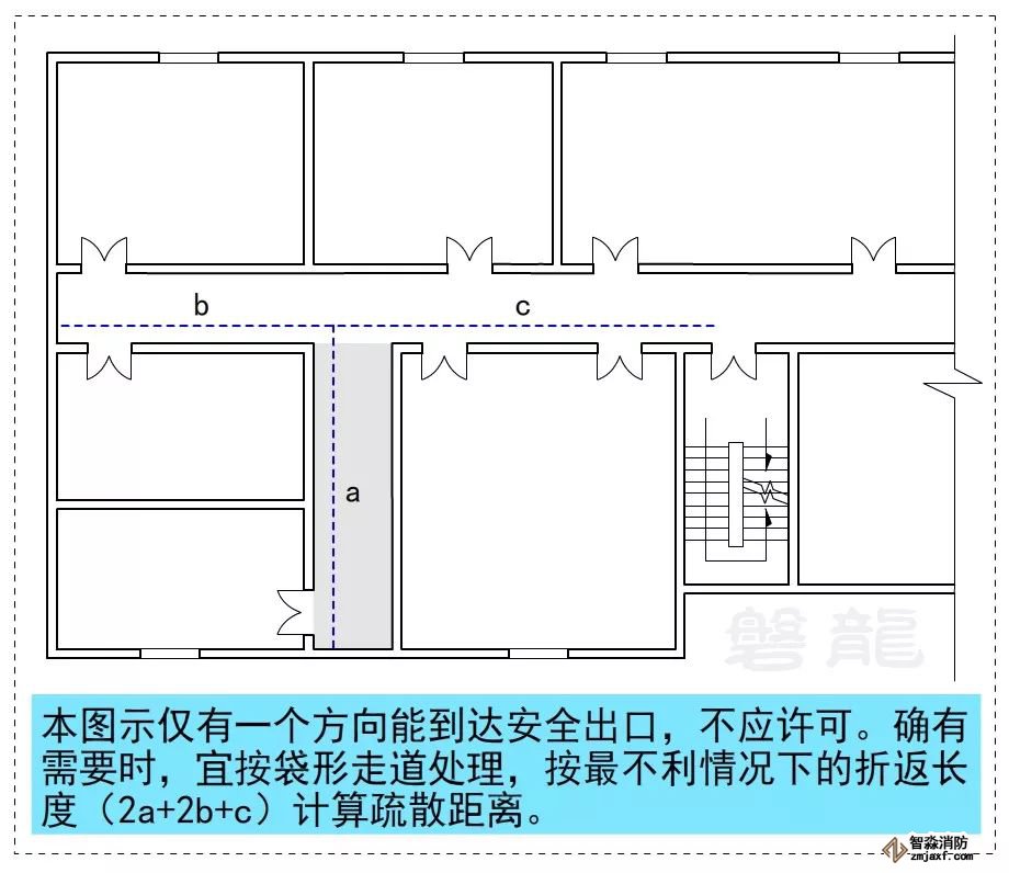 注:本圖示僅有一個方向能到達(dá)安全出口,不應(yīng)許可。確有需要時(shí),宜按袋形走道處理,按最不利情況下的折返長度(2a+2b+c)計(jì)算疏散距離。比如,一二耐火等級的高層教學(xué)建筑:(2a+2b+c)≤15m。
