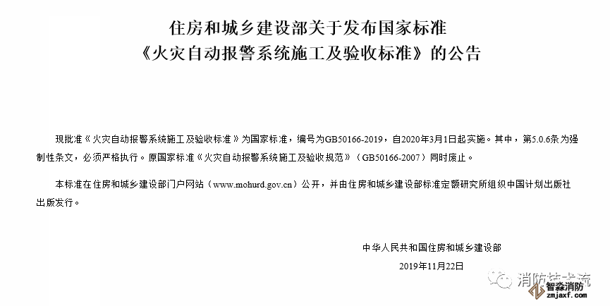 在《火災自動報警系統(tǒng)設計規(guī)范》GB 50116-2013已經(jīng)實施多年,其對應的施工及驗收規(guī)范卻一直沒有更新,只能沿用《火災自動報警系統(tǒng)施工及驗收規(guī)范》GB 50166—2007,而設計規(guī)范增加了許多新內(nèi)容,是施工驗收規(guī)范沒有的,因此也給施工驗收帶來了一些不便。近日,住建部官網(wǎng)終于發(fā)布公告,《火災自動報警系統(tǒng)施工及驗收標準》GB50166-2019,于2020年3月1日正式實施。