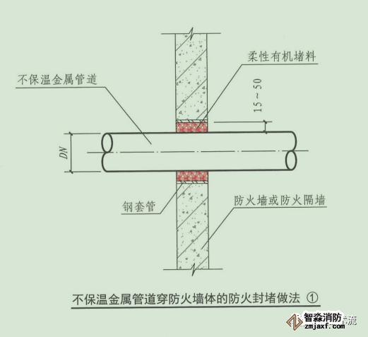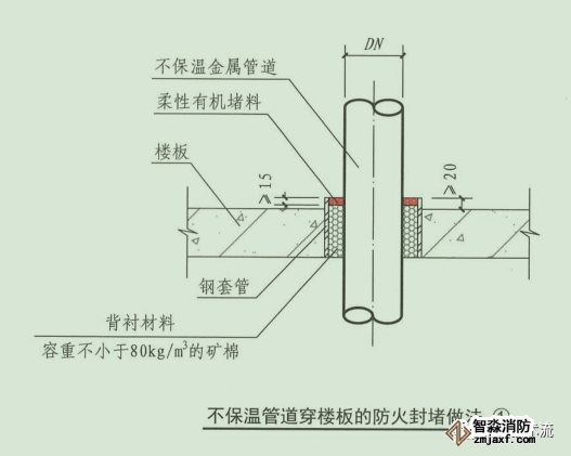 環(huán)形間隙應(yīng)采用無機(jī)或有機(jī)防火封堵材料封堵;或采用礦棉等背襯材料填塞并覆蓋有機(jī)防火封堵材料;或采用防火封堵板材封堵,管道與防火封堵板材之間的縫隙填塞有機(jī)防火封堵材料