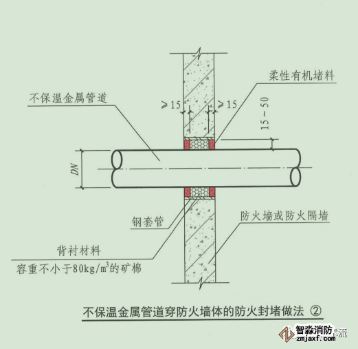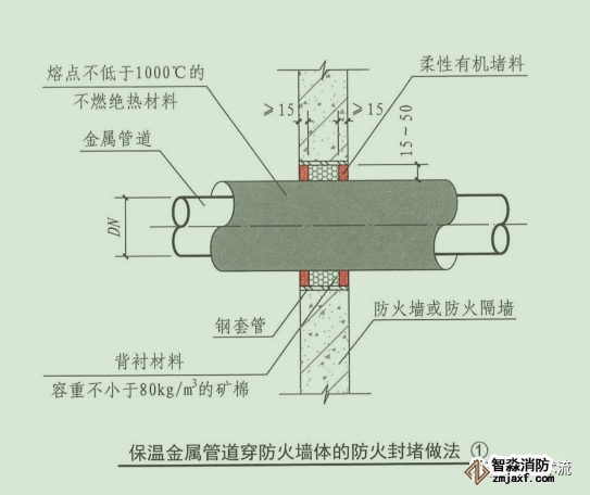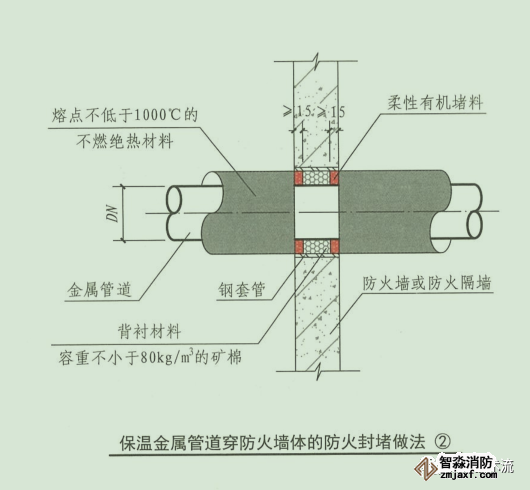 當(dāng)絕熱層為熔點(diǎn)不小于1000 ℃的不燃材料或貫穿部位未采取絕熱措施時(shí),其防火封堵應(yīng)符合上述本條第1款的規(guī)定;