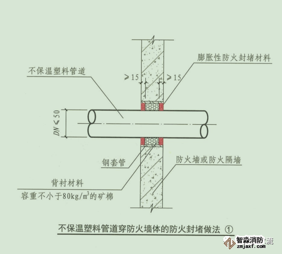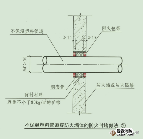 3.塑料管道貫穿防火隔墻、樓板和防火墻時(shí),貫穿孔口的環(huán)形間隙應(yīng)采用礦棉等背襯材料填塞并覆蓋膨脹性的防火封堵材料;或采用防火封堵板材封堵,管道與防火封堵板材之間的縫隙填塞膨脹性的防火封堵材料.對(duì)于公稱尺寸大于 50mm的管道,還應(yīng)在豎向貫穿部位的下側(cè)或水平貫穿部位兩側(cè)的管道上設(shè)置阻火圈或阻火包帶。