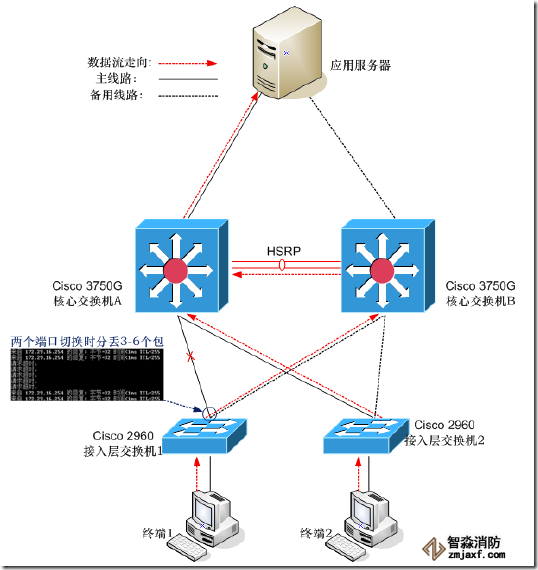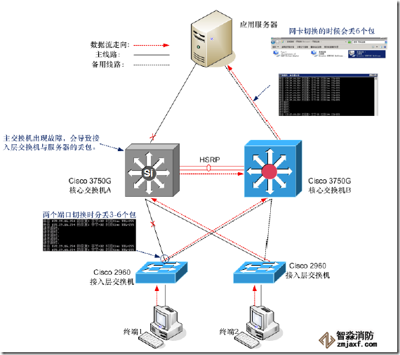 當(dāng)服務(wù)器與核心交換機(jī)A之間主鏈路出現(xiàn)故障(如線路、網(wǎng)卡等),服務(wù)器主網(wǎng)卡切換至備用網(wǎng)卡上時(shí),會(huì)丟6個(gè)數(shù)據(jù)包,但當(dāng)主鏈路恢復(fù)以后,服務(wù)器會(huì)自動(dòng)從備用網(wǎng)卡切換至主網(wǎng)卡,而這次切換時(shí)數(shù)據(jù)包不會(huì)丟失。具體終端訪問服務(wù)器的數(shù)據(jù)流走向如下圖。