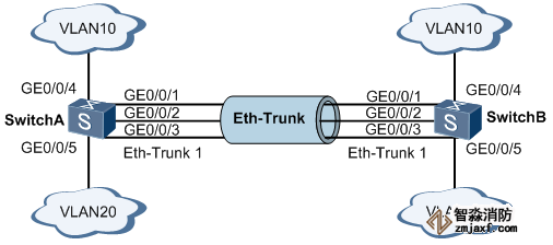 如上圖所示,SwitchA和SwitchB通過以太鏈路分別都連接VLAN10和VLAN20的網(wǎng)絡(luò),且SwitchA和SwitchB之間有較大的數(shù)據(jù)流量。