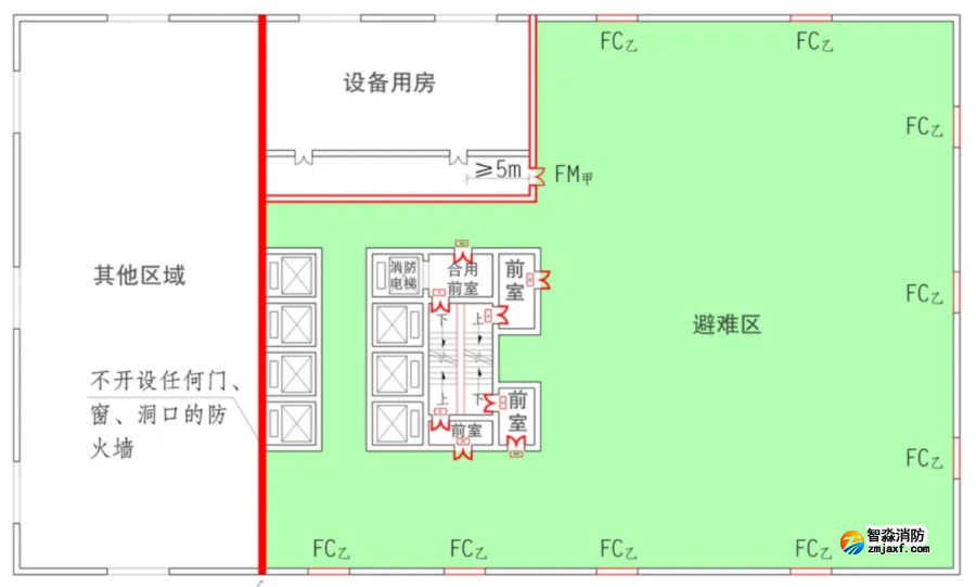 原則上,當(dāng)避難層的避難區(qū)和設(shè)備用房的面積較小時(shí),可將避難層的局部區(qū)域作為其他功能,但應(yīng)采用不開設(shè)任何洞口的防火墻分隔,避難區(qū)應(yīng)至少有兩個(gè)面靠外墻,參見【圖示】。在實(shí)際應(yīng)用中,這種處理方式主要適應(yīng)于住宅建筑,說明如下: