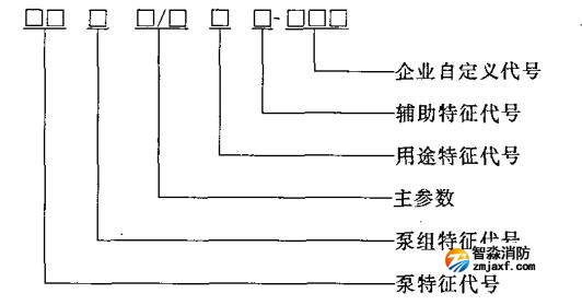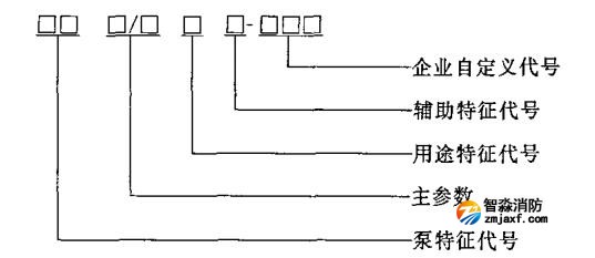 4.2.2 消防泵組型號由泵特征、泵組特征代號、主參數(shù)、用途特征代號、輔助特征代號及企業(yè)自定義代號等六個部分組成。其組成形式如下: