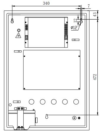 氣體滅火控制器采用壁掛式安裝,安裝尺寸如圖5-8所示。用3個(gè)M6的膨脹螺栓將GST-QKP04固定在牢固的墻壁上,膨脹螺栓的水平間距為340mm,高度相距472mm。