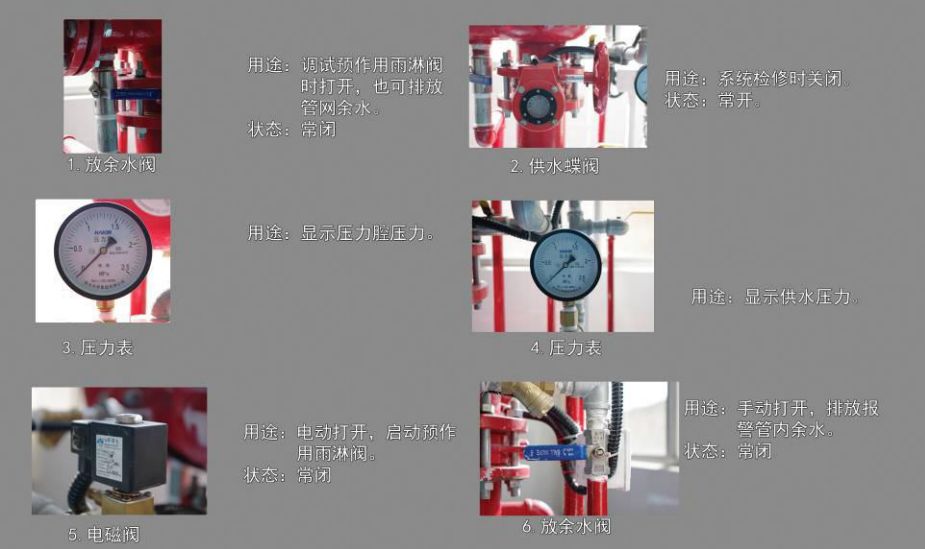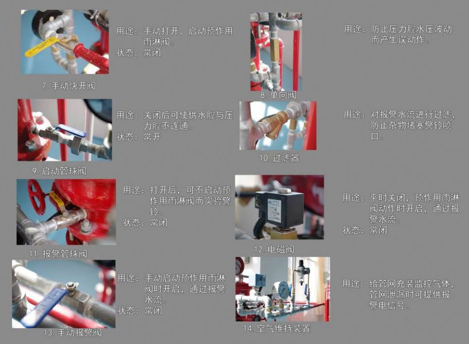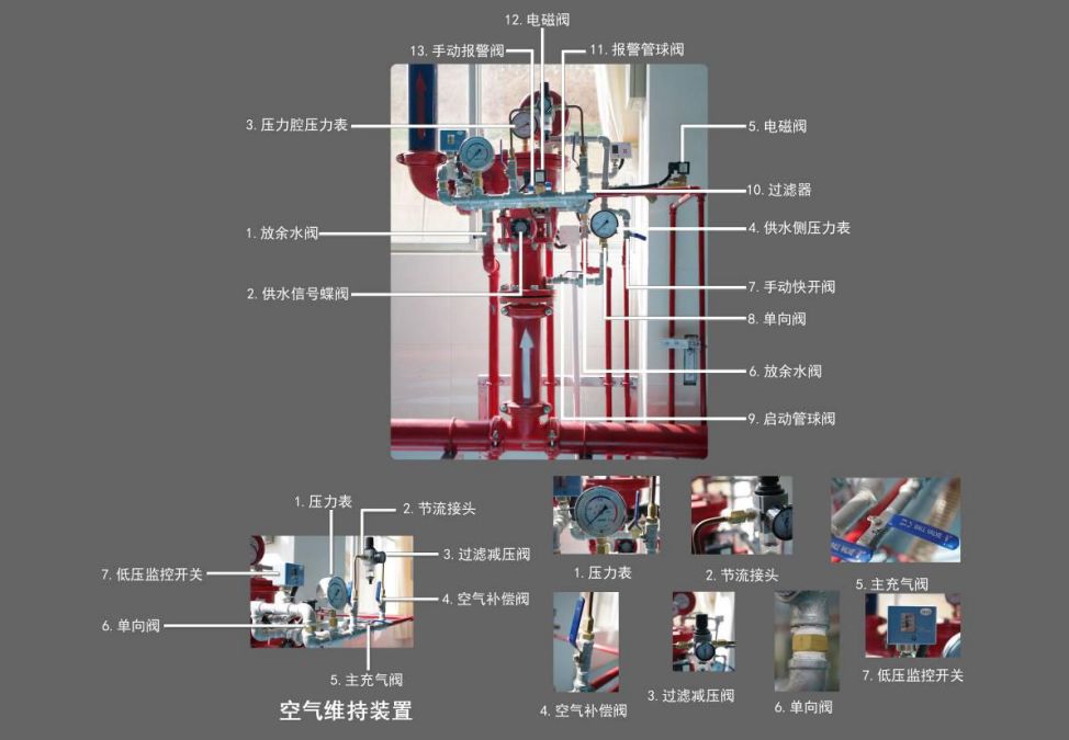 保護(hù)區(qū)域出現(xiàn)火警時(shí),探測(cè)系統(tǒng)首發(fā)動(dòng)作,打開(kāi)預(yù)作用雨淋閥以及系統(tǒng)中用于排氣的電磁閥(出口接排氣閥),此時(shí)系統(tǒng)開(kāi)始充水并排氣,從而轉(zhuǎn)變?yōu)闈袷较到y(tǒng),如果水勢(shì)繼續(xù)發(fā)展,閉式噴頭開(kāi)啟噴水,進(jìn)行滅火。這樣就克服了雨淋系統(tǒng)會(huì)因探測(cè)系統(tǒng)誤動(dòng)作而導(dǎo)致誤噴的缺陷。如果系統(tǒng)中任一噴頭玻璃球意外破碎,則會(huì)從該噴頭處噴出氣體,導(dǎo)致系統(tǒng)中氣壓迅速下降,降低監(jiān)控開(kāi)關(guān)動(dòng)作,發(fā)出報(bào)警信號(hào),提醒值班人員出現(xiàn)異常情況,但預(yù)作用雨淋閥沒(méi)有動(dòng)作,所以系統(tǒng)不會(huì)噴水,從而克服了濕式系統(tǒng)會(huì)因噴頭誤動(dòng)作所引起誤噴造成水漬的缺陷。