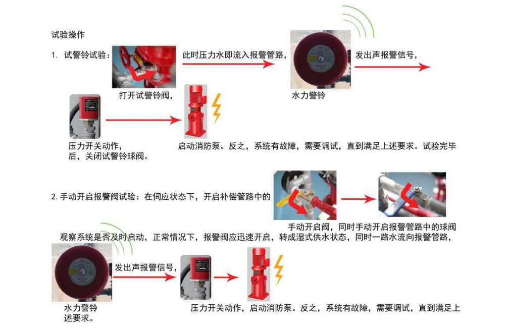 打開(kāi)濕式報(bào)警閥管路中的報(bào)警試驗(yàn)閥,或打開(kāi)設(shè)置在噴淋管路系統(tǒng)末端的試驗(yàn)裝置對(duì)水力警鈴進(jìn)行試驗(yàn)。