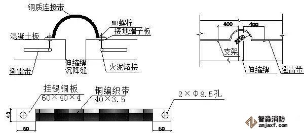 ⑶避雷帶、接地母線在過(guò)沉降縫、伸縮縫根據(jù)以下圖示做成半圓形,既保證美觀又符合防雷接地要求。