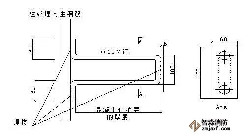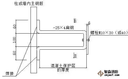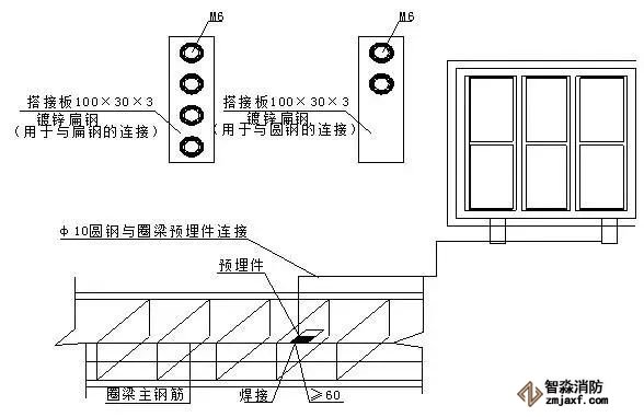 ⑶φ10的金屬圓鋼與鋼筋或窗框等建筑物金屬構(gòu)件焊接長(zhǎng)度不小于60mm。
