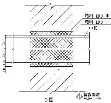 ⑵B圖電纜穿過(guò)墻上的孔洞,間隙用堵料填塞。