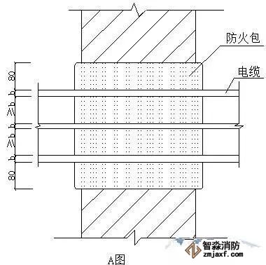 ⑴A圖用防火包封堵墻上孔洞,電纜從防火包內(nèi)穿過(guò)。