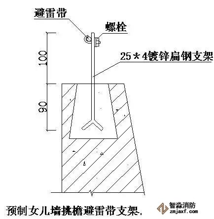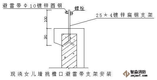 ⑴現(xiàn)澆女兒墻挑檐避雷帶支架安裝做法如下圖,扁鋼支架在安裝時(shí)要密切和土建專業(yè)配合好,對(duì)成排的避雷帶支架的水平度、垂直度要拉線逐個(gè)檢查。