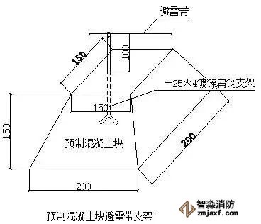 ⑸ 屋頂避雷帶支架在預(yù)制混凝土塊上安裝做法: