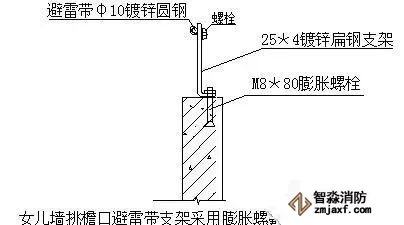 ⑶ 女兒墻挑檐避雷帶支架用膨脹螺栓固定安裝做法如下圖: