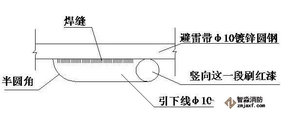⑵引下線在女兒墻與避雷帶之間這一段要刷紅色的油漆做明顯的標(biāo)記,在防雷檢查驗(yàn)收時(shí),避雷引下線處很顯眼,一看就明白此處為引下點(diǎn),見下圖。