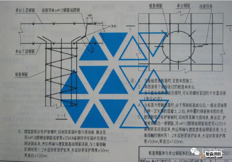 接地裝置 利用建筑物基礎(chǔ)圈梁內(nèi)(外圍)對角的二根主鋼筋焊接成環(huán)網(wǎng)(主筋小于ø12的須采用4根主筋),引下線與環(huán)網(wǎng)焊成一體。接地體(線)的連接應(yīng)采用焊接,焊接處焊縫應(yīng)飽滿并有足夠的機械強度,不得有夾渣、咬肉、裂紋、虛焊、氣孔等缺陷,焊接處的藥皮敲凈后,做防腐處理。基礎(chǔ)接地工程完工后,在各接地極引出線處作接地電阻測試,要求接地電阻R<1歐姆,未能達到要求時,須增加人工接地極,直到符合要求為止。