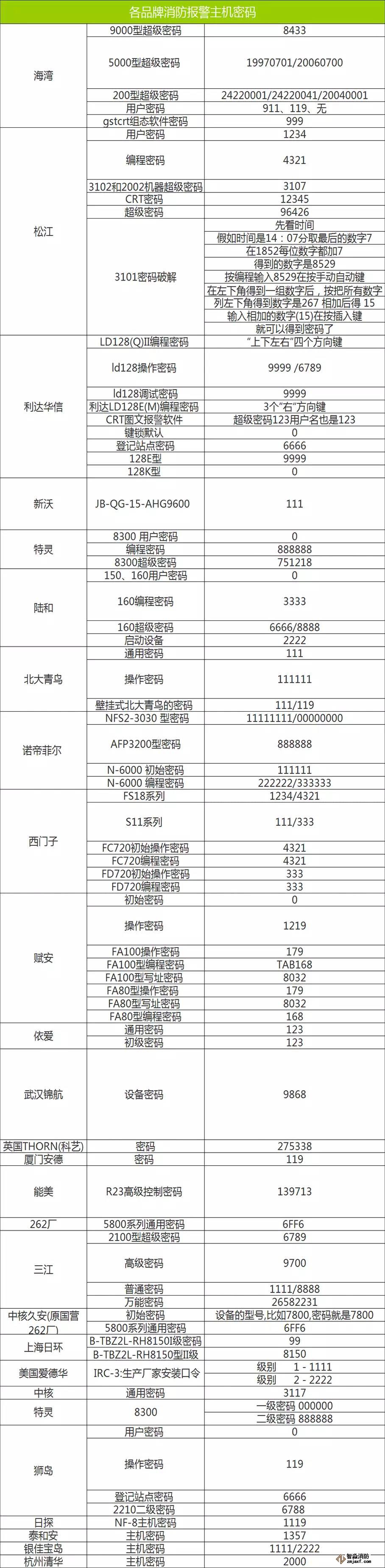 你還在為忘掉控制器密碼而發(fā)愁嗎?維保調試時還為不知控制器密碼而無奈嗎?下表各家火災報警控制器的密碼表格。