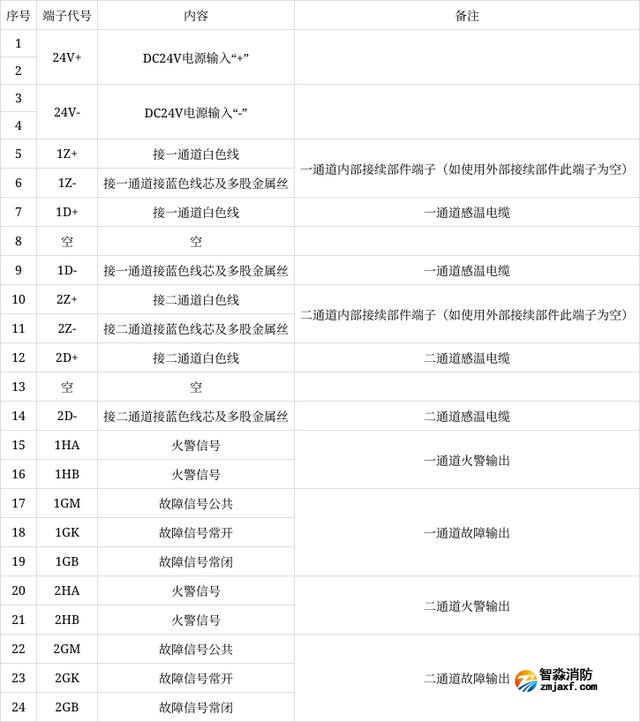 按圖3要求,將24V電源線、信號(hào)線從防水接頭穿入盒體,接入相應(yīng)的接線端子,感溫線纜兩端穿入微電腦處理器和終端盒上的防水接頭,擰緊防水接頭。一通道感溫電纜白色線芯接1D+端子,藍(lán)色線芯及金屬絲接1D-端子,(如使用信號(hào)處理單元內(nèi)部的接繼部件,感溫電纜的另一端白色線芯接在1Z+端子、藍(lán)色線芯接1Z-端子)。二通道感溫電纜白色線芯接2D+端子,藍(lán)色線芯及金屬絲接2D-端子,(如使用信號(hào)處理單元內(nèi)部的接繼部件感溫電纜的另一端白色線芯接在2Z+端子、藍(lán)色線芯接2Z-端子)。